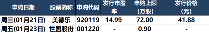 美德乐(920119.BJ):申购价格41.88元,发行市盈率14.99倍,申购上限72.00万股;