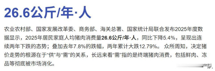 尽头是年青东说念主,越来越正式健康,越来越怕胖,谁还天天大口吃五花肉?数据走漏,2025年住户家庭东说念主均猪肉破钞量26.6公斤,同比降幅5.4%,猪肉在统共肉类破钞中的占比,从2018年的62.1%降到了2025年的57.8%。
