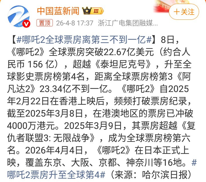 《哪吒2》民众票房,在爽直节后,杰出《泰坦尼克号》!国产电影票房影响力,在国际阛阓,越来越大! 据干系媒体报说念,《哪吒2》民众票房达到22.67亿好意思元,升至民众第4! 一时分,网友们纷纷暖和这一话题音讯!