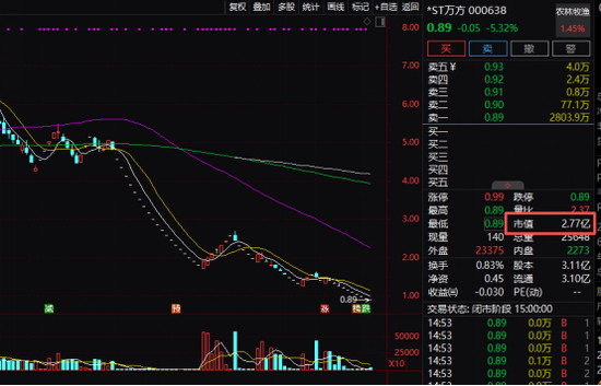 4月13日,主板A股公司*ST万方股价再度下落,收报0.89元/股,总市值已仅约2.77亿元,这是公司总市值集会第20个交游日低于5亿元。