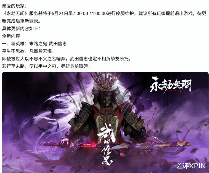 比如 22 年 4 月到 7 月这四个月里,制作组除了和被误封的玩家 battle,和一些不痛不痒的小行为跟皮肤,剩下的主要责任试验就唯有武田信忠这一个脚色。