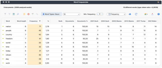 上表展示了2001–2021 年间六篇美国总统就职演说中出现频率最高的前 10 个名词,并按文档分别呈现。这种设置既聚焦于富含概念的词汇,又便于对各演说者进行横向比较。