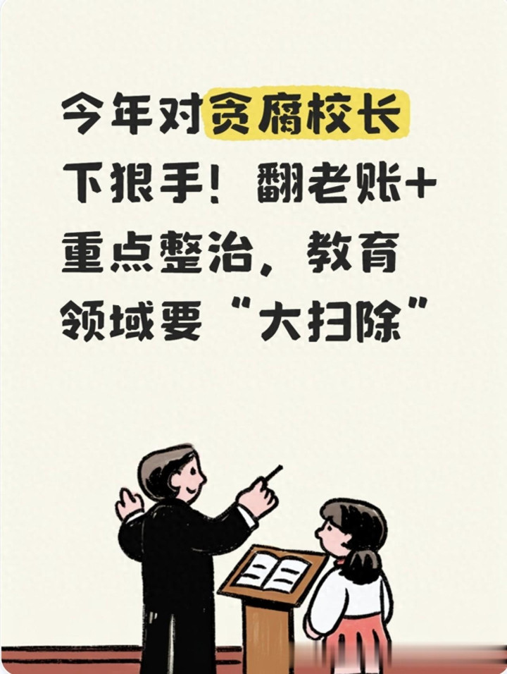 教育是国之大计,校园本应是教书育人的净土,可近些年个别校长借着手中的权力搞贪腐,克扣学生伙食费、在基建采购中收好处、招生环节“开后门”,把孩子们的“成长钱”变成自己的“零花钱”,寒了无数家长和老师的心。大家早就盼着能对教育领域的贪腐问题动真格,2026年开年就传来重磅消息:二十届中央纪委五次全会明确把教育纳入重点反腐整治范围,和金融、国企、能源这些高风险领域并列,针对贪腐校长的整治行动全面升级——不仅查当下的问题,还会翻老账、算旧账,不管是陈年旧案还是隐性腐败,一律深挖到底。这次教育领域的“大扫除”,就是要把这些害群之马清出去,还给校园一片清风正气。