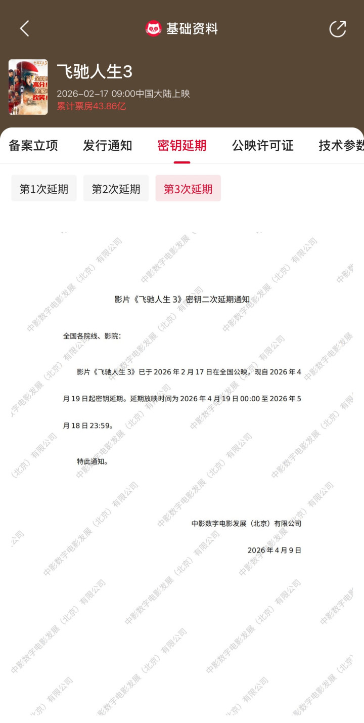 IT之家4月9日音尘,韩寒赛车电影《飞奔东谈主生3》官宣密钥宽限,延迟上映至2026年5月18日,据猫眼专科版数据,狂妄现时累计票房已超43.86亿。